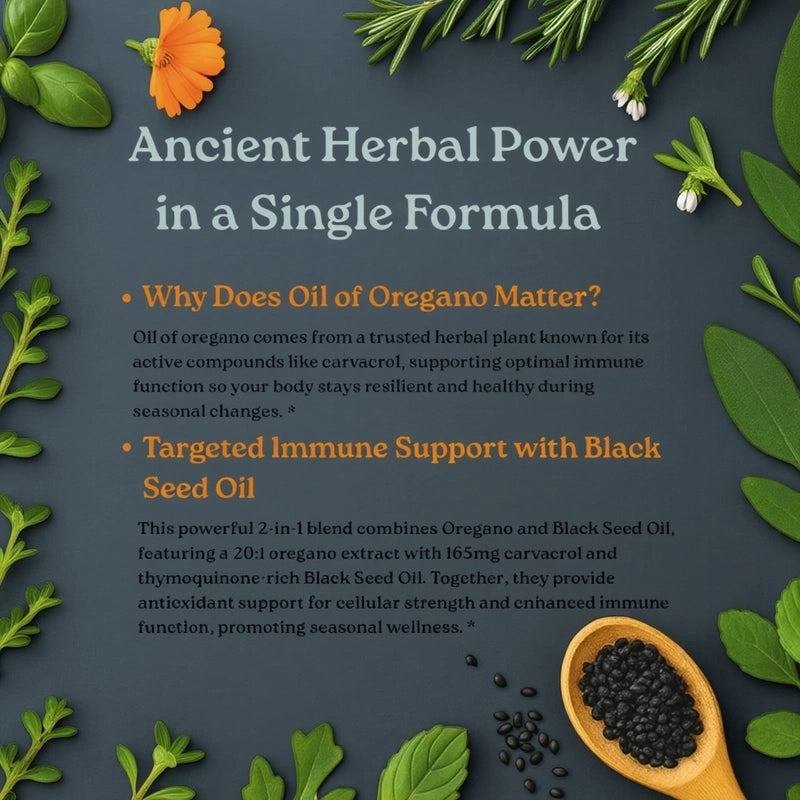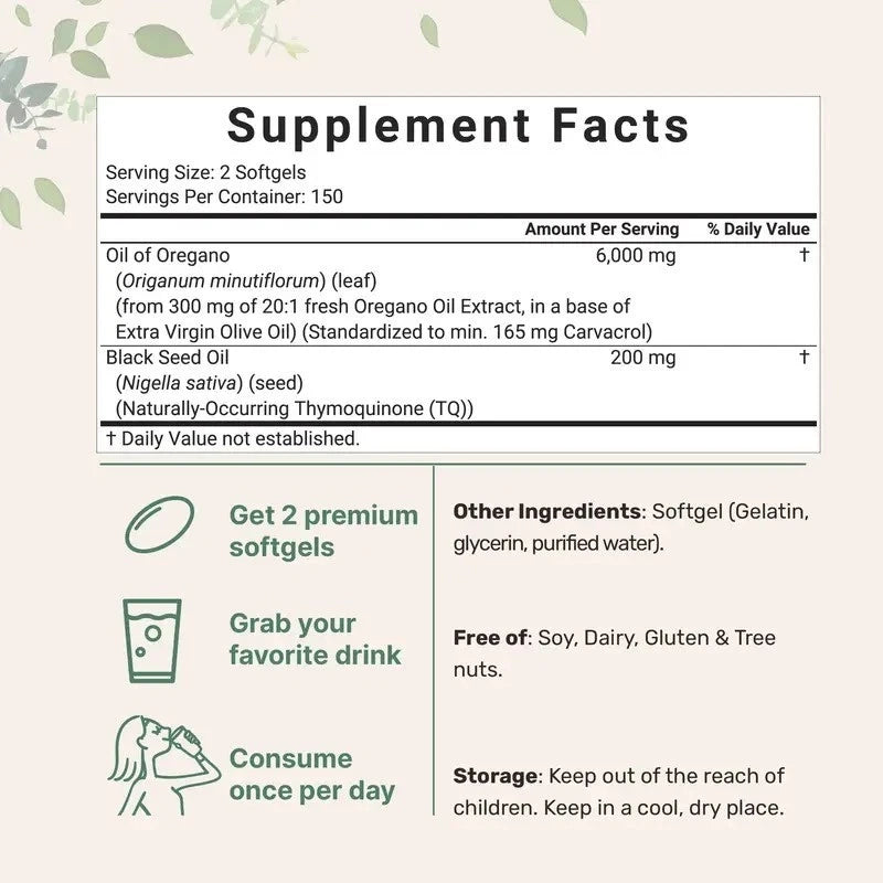 Our oregano oil softgels are packed with carvacrol and thymoquinone, powerful compounds known to support your body's natural immune response and overall wellness.